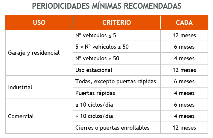 En caso de no existir instrucciones de mantenimiento del fabricante en puertas existentes, éstas deben ser suministradas por la empresa de mantenimiento. Las periodicidades mínimas recomendadas están establecidas en la norma UNE 85635, las cuales se indican en la siguiente tabla: